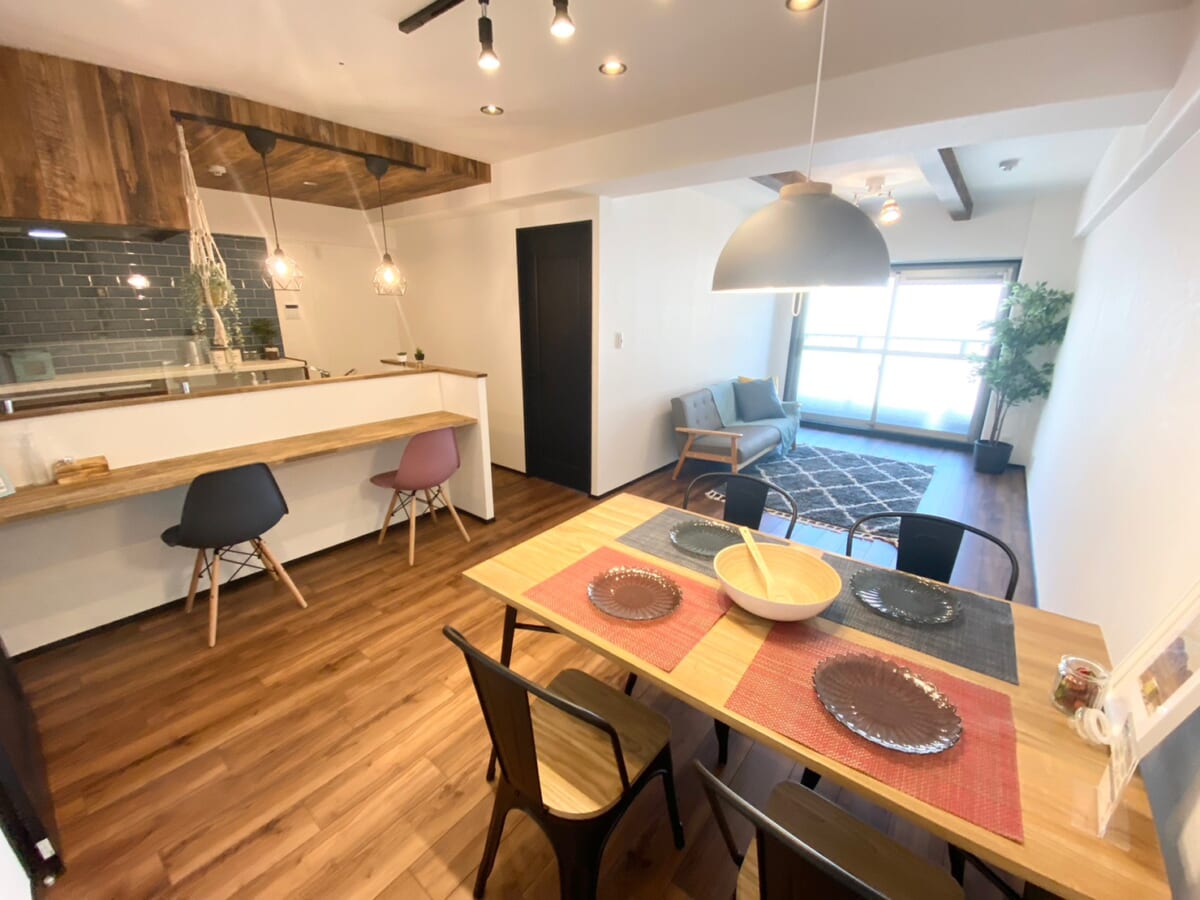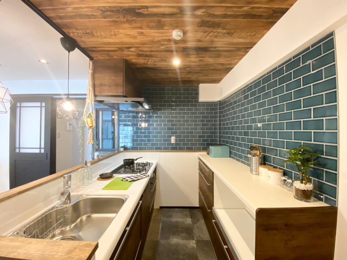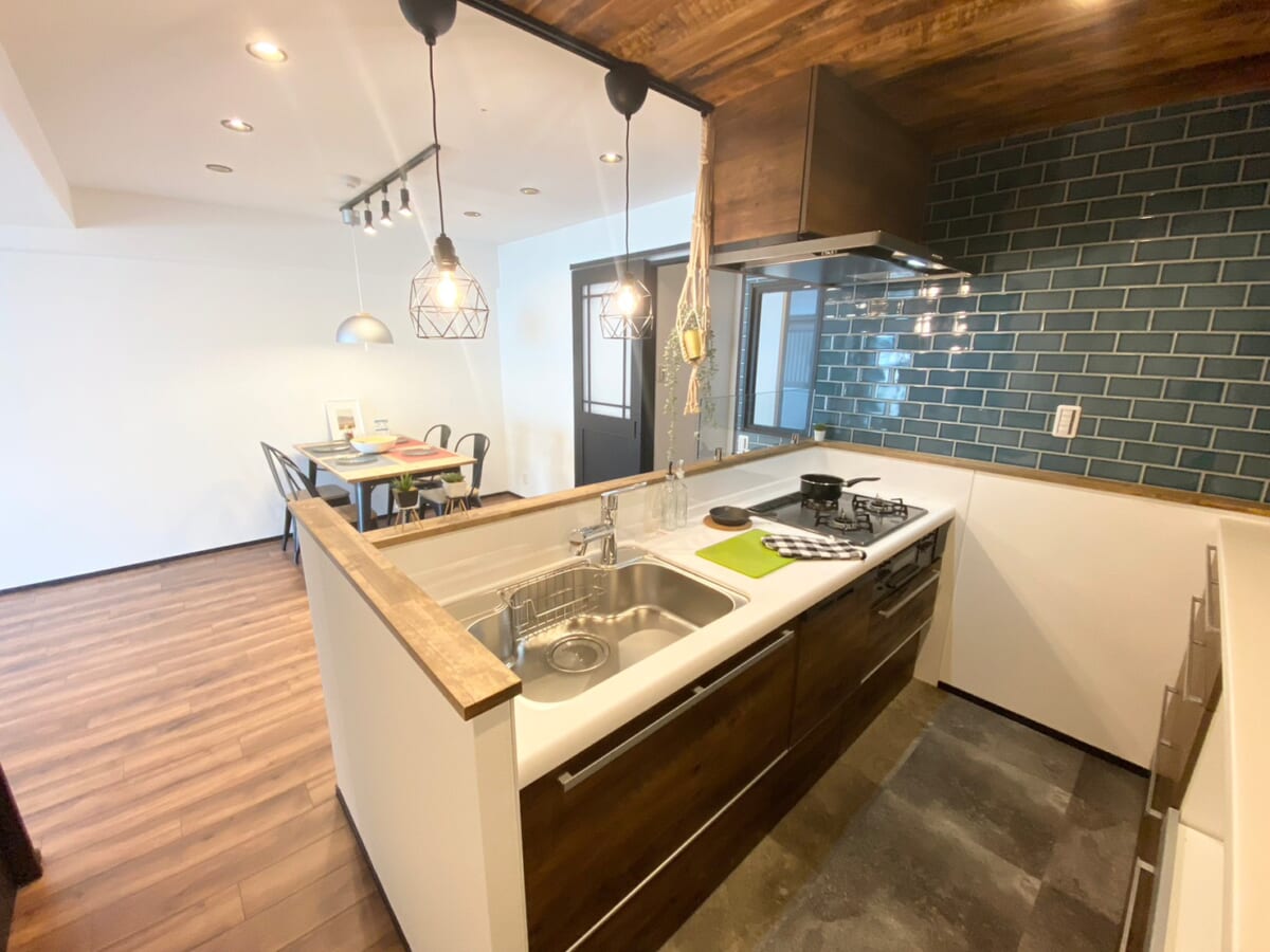キッチンの前面部分には大きなカウンターを設置し、カフェカウンターのような雰囲気を演出。また、そのカフェカウンターの横には玄関を覗ける小窓、通称「おかえり窓」を設置致しました。 -