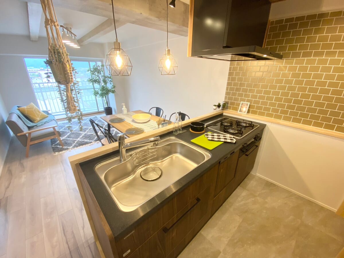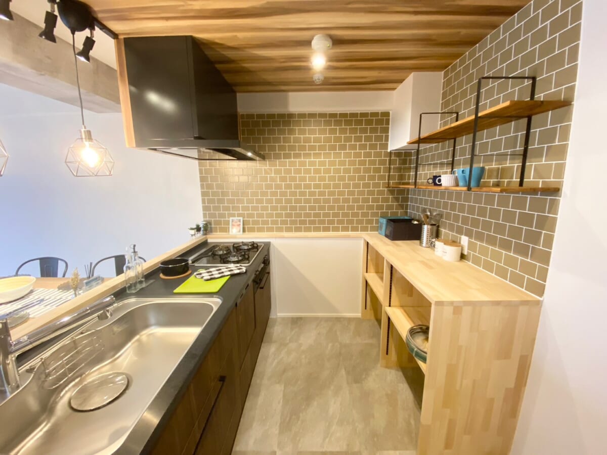 キッチンカウンターの上部にはダクトレールを敷き、ペンダントライトで温かみのある雰囲気となっております。 -
