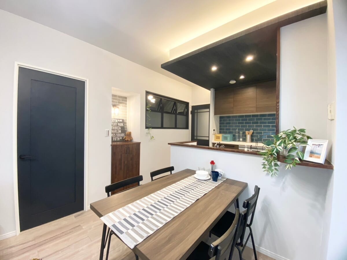 日常を少しでも「ワクワク」できるようにお洒落な雰囲気造りを心掛けました。家族の憩いの場であるリビングは最新のトレンドが満載です。(室内タイル、室内窓、折り下げ天井や間接照明等)