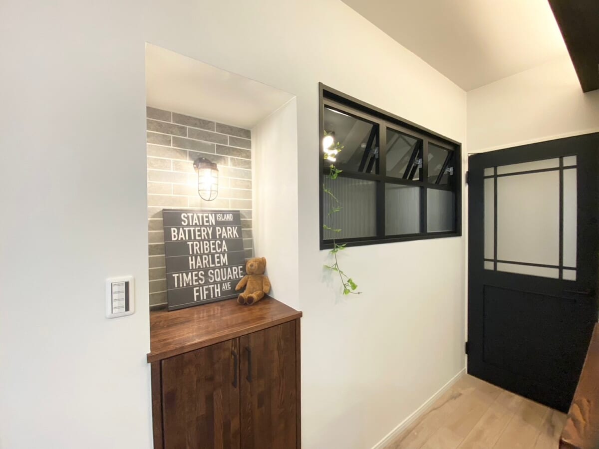 リビング部分の収納の上部は室内タイルとマリン照明を付け、雰囲気のある空間に仕上げました。 -