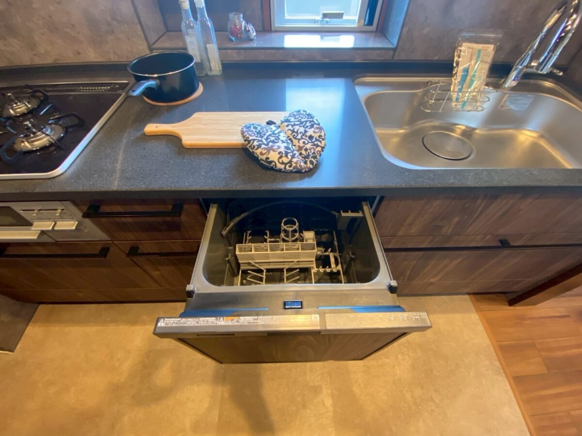 リビングは木目を基調とした空間に仕上げましたが、キッチン部分のパネルは濃いめのカラーを選びアクセントにしました。