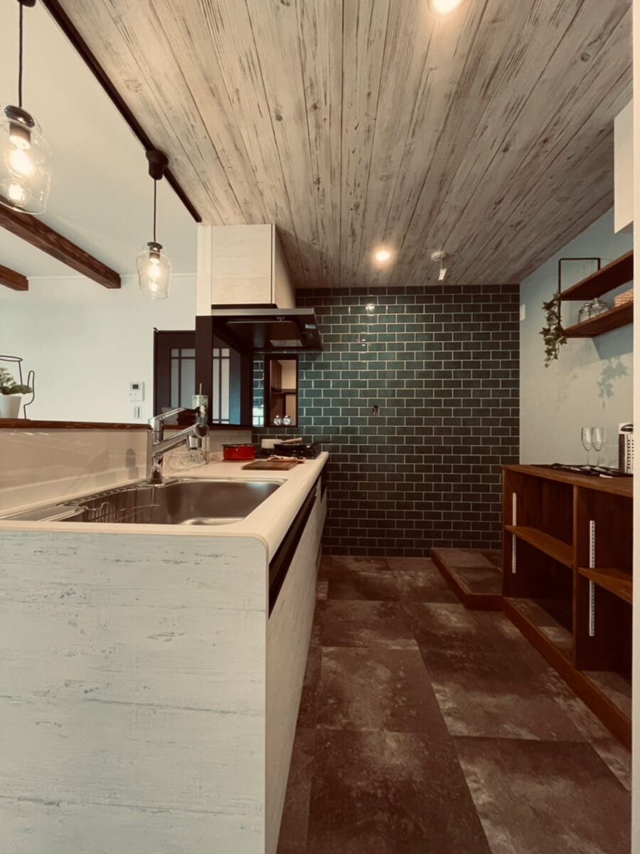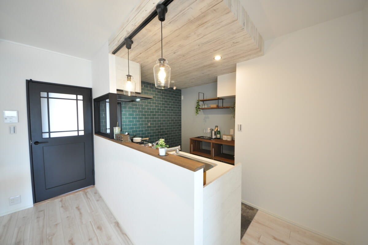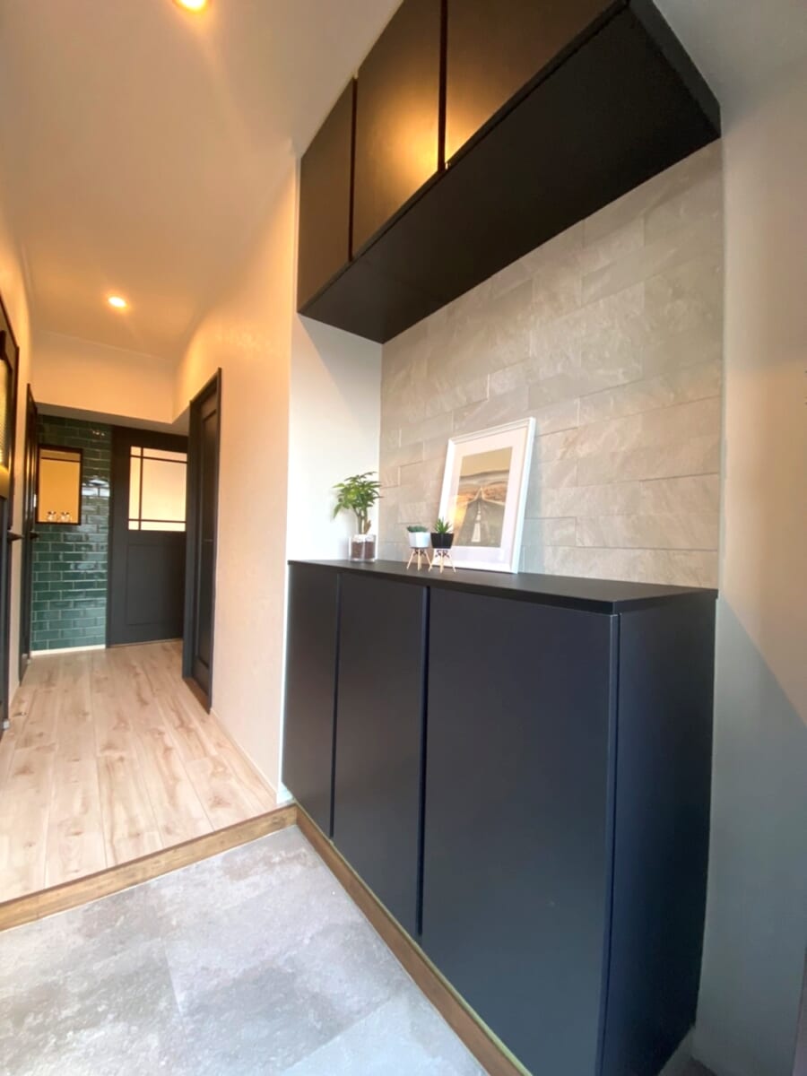 廊下の物入を飾り棚へ変更し、入り口を広げることでキッチンスペースの広さが確保されゆとりのあるリビングスペースに改装できました。