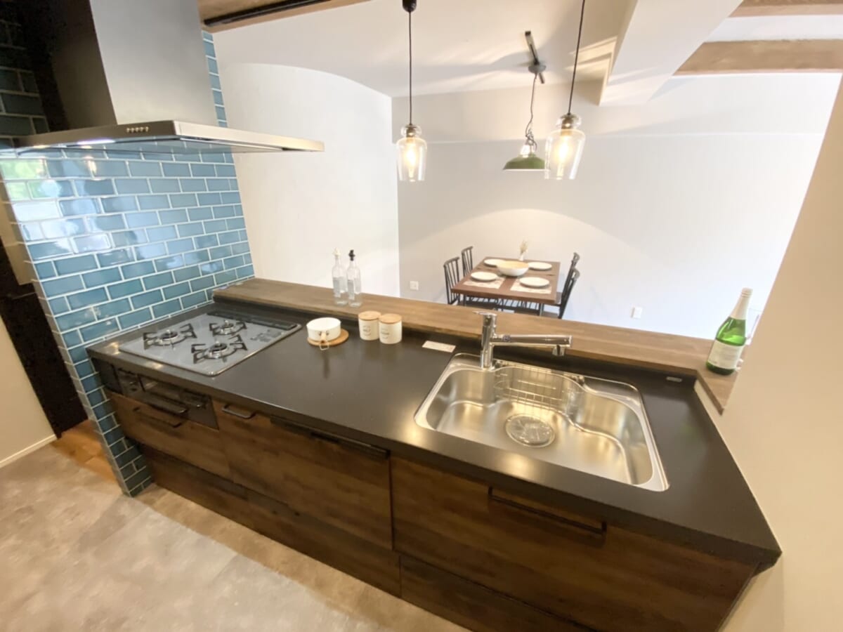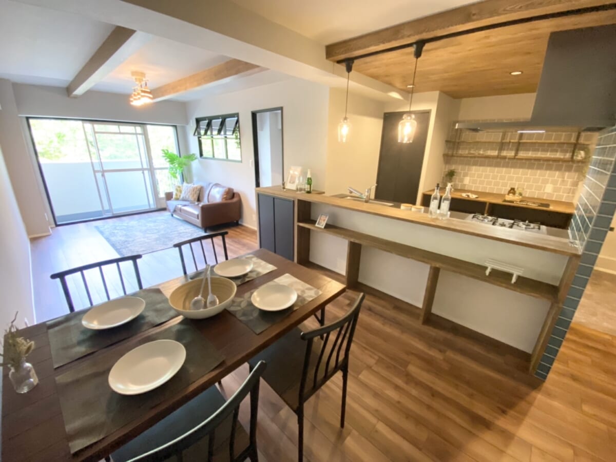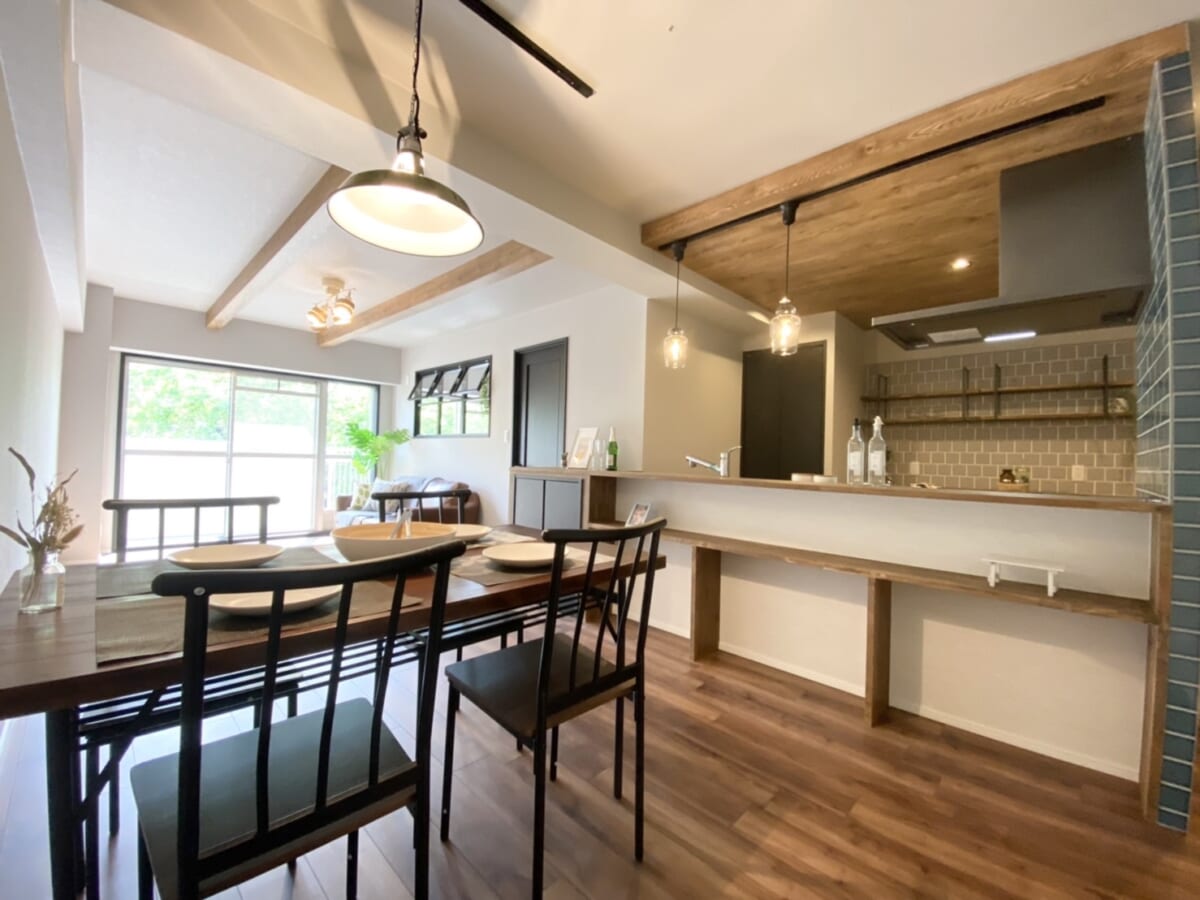 3LDKの間取りを2LDKへ改装しました。リビングのゆとりと収納を増やすことで家事導線に優れた使い勝手の良い間取りへと変更。緑豊かな緑地公園の雰囲気を活かしつつ、お洒落なカフェテイストに仕上げた内装は友人を招きたくなるような空間です。