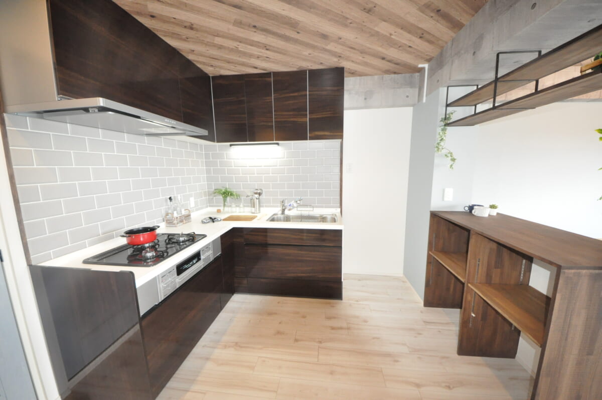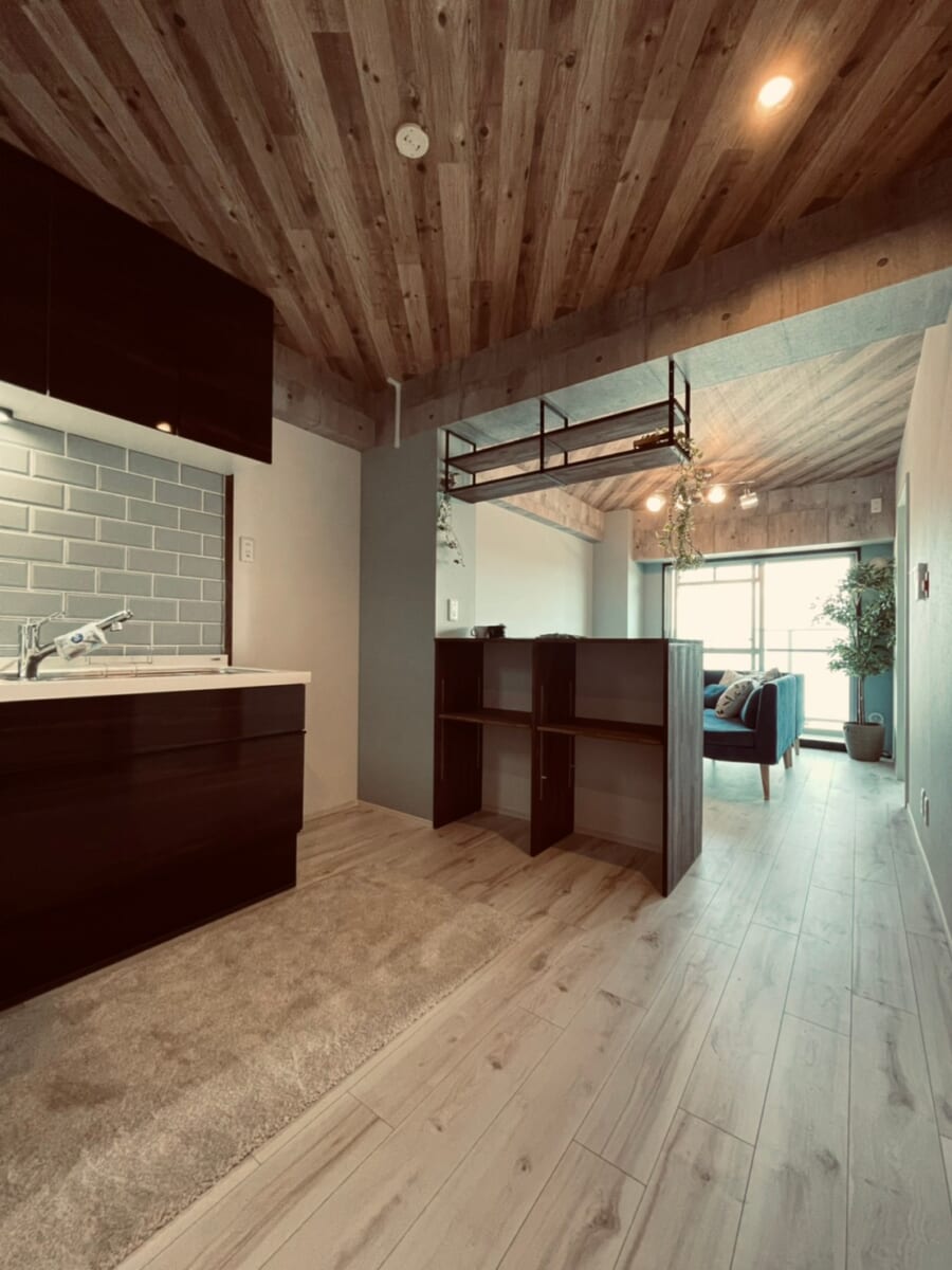 ウッド調・タイル・コンクリ-ト調をMIXしオシャレ空間を演出