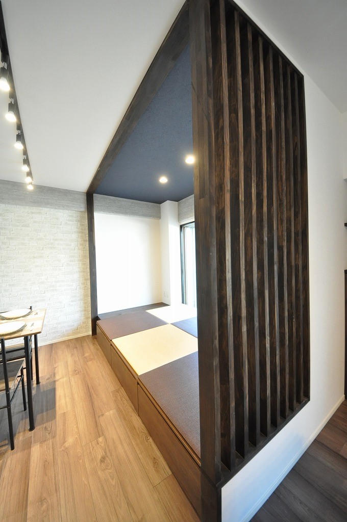 今回はリビングと隣接した小上がりを施工し、その部分に琉球畳を敷き、中は収納スペースにしました。タイルなども施しリビングスペースは友人を招きたくなるような映えスポットに。