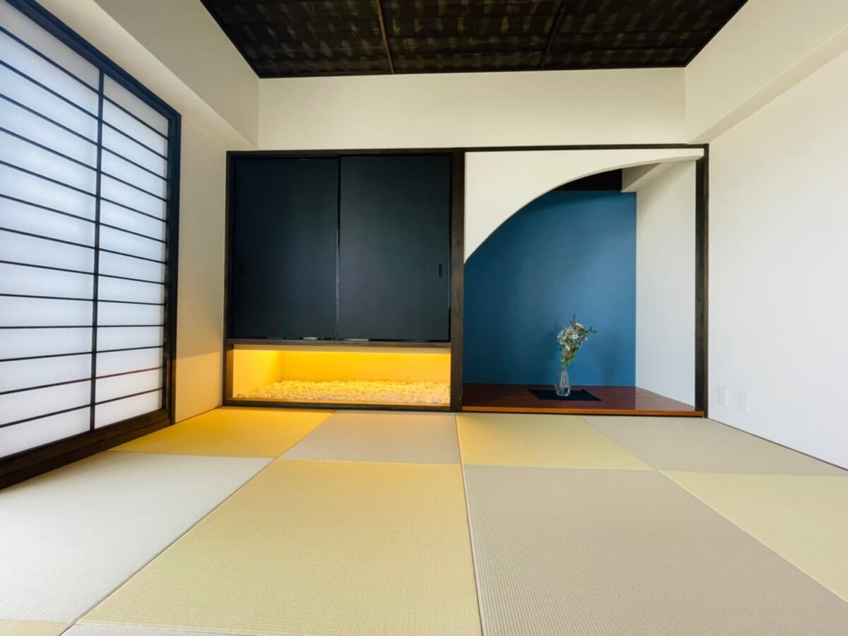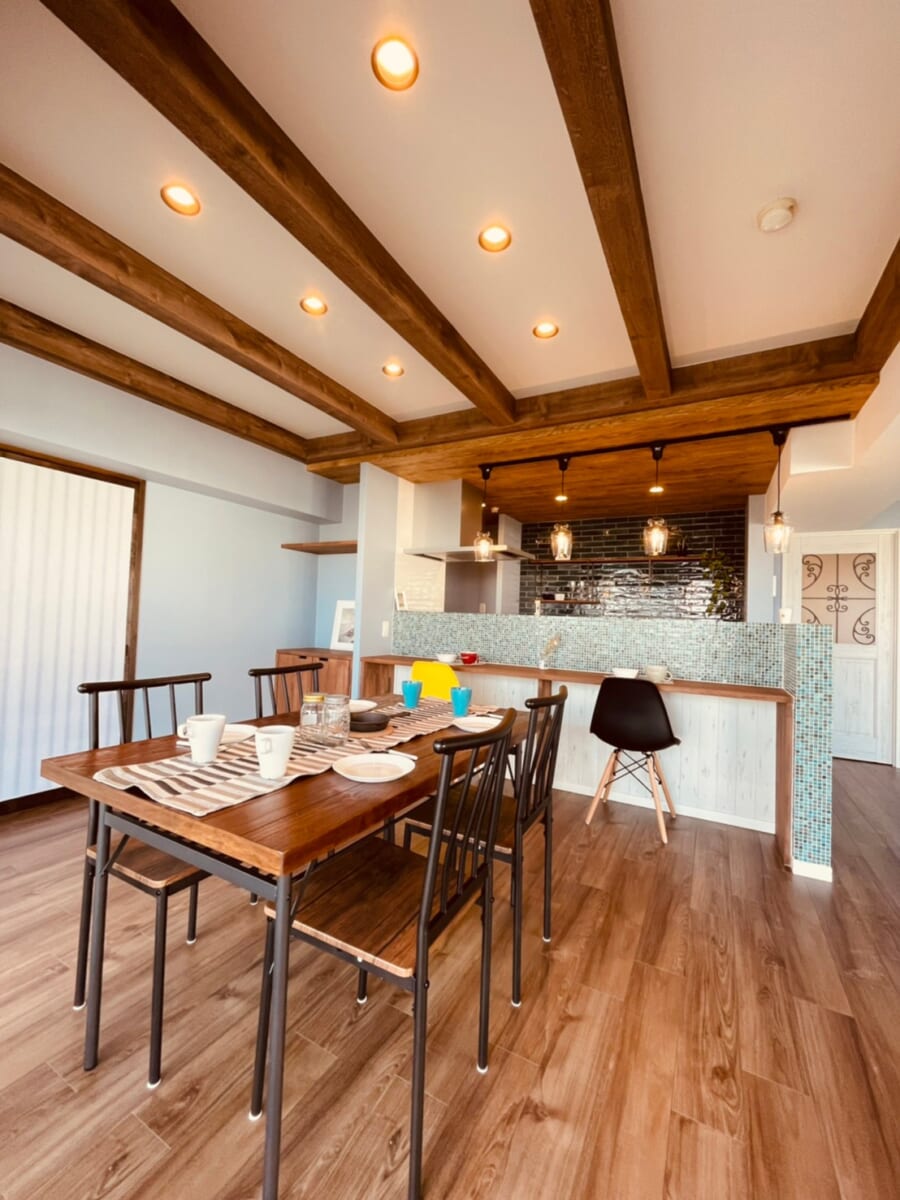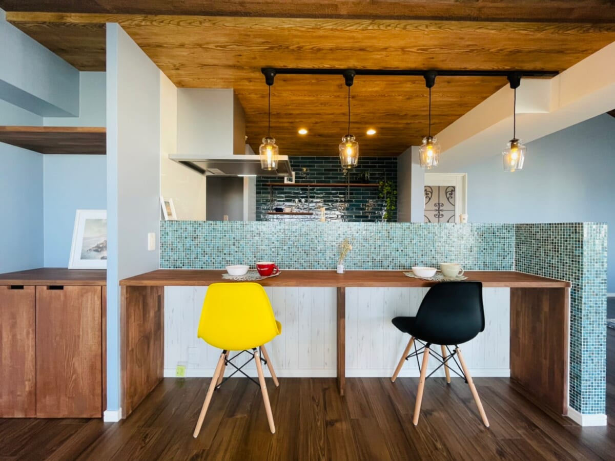海と山が眺望できる最高のロケーション。 ハワイアンテイストで仕上げました。 リビングは鮮やかなブルーと木目で解放感溢れる空間となっております。